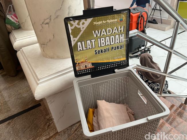 Setelah selesai salat, mukena yang sudah dipakai harus diletakkan dalam keranjang yang tertulis "Wadah Alat Ibadah Sekali Pakai". Dan petugas pun mengarahkan untuk menaruh mukena tersebut di dalam keranjang untuk nanti dilaundry.