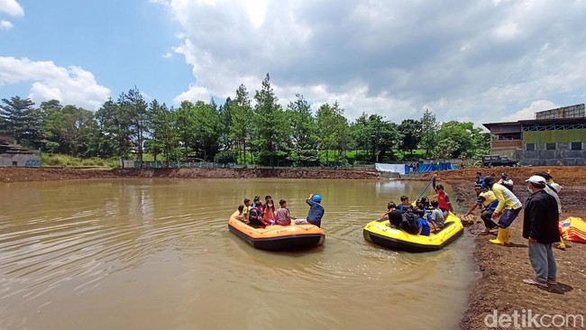 Disambut teriak gembira anak-anak, rakit mulai meninggalkan tepi kolam. Mereka ingin merasakan langsung berada di atas kolam yang memiliki kedalaman sekitar 3 meter itu