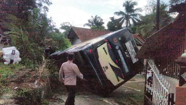 Bus oleng lalu bergerak ke kanan dan menghantam rumah milik warga sebelum akhirnya bus terguling ke kanan.