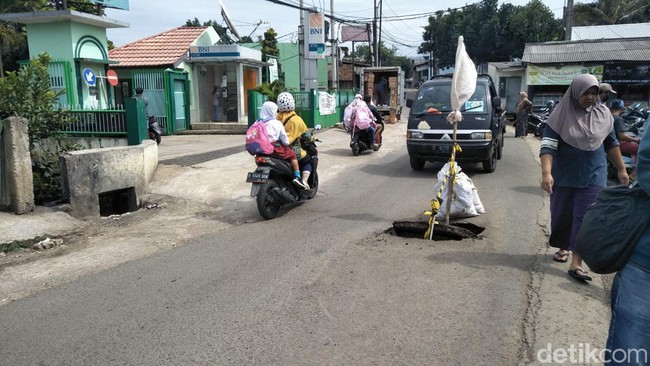Posisi lubang yang tepat berada di tengah jalan itu membahayakan pengendara yang melintas karena cukup dalam. Alhasil lubang itu dipasangi kayu dibalut plastik sebagai penanda agar tak dilibas kendaraan.