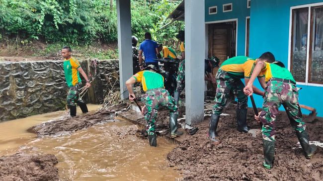 Mereka diterjunkan untuk membantu masyarakat mengevakuasi material banjir bandang yang menerjang rumah warga. Komandan Yonif 303/SSM Letkol Infanteri M Sujoko memimpin langsung pasukannya.