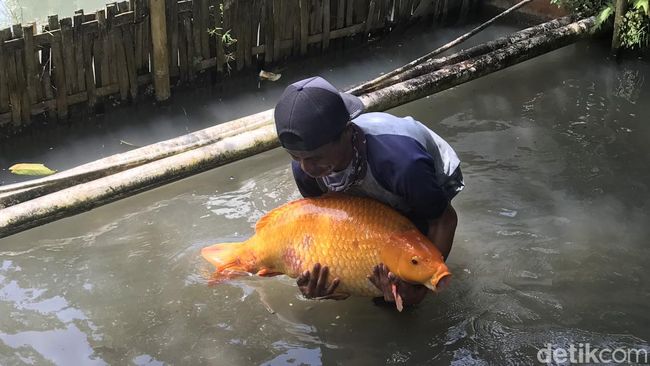 Lebih lanjut, ikan mas raksasa itu merupakan jenis ikan blasteran antara ikan mas dan ikan koi. Terlihat dari sisik metalic yang memiliki warna kuning keemasan dan lebih terang.