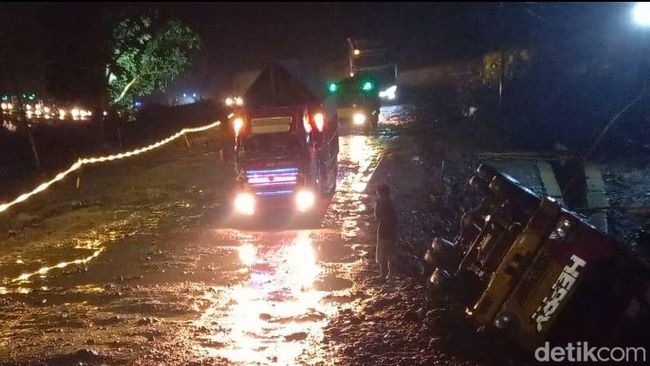 Sebuah dump truk terguling tepat di lokasi amblasan jalan di Jalan Raya Cirebon - Sumedang atau tepatnya di Kawasan Cireki, Kecamatan Tomo, Kabupaten Sumedang, Jumat (11/3/2022) malam. Dalam kejadian itu tidak ada korban jiwa.
