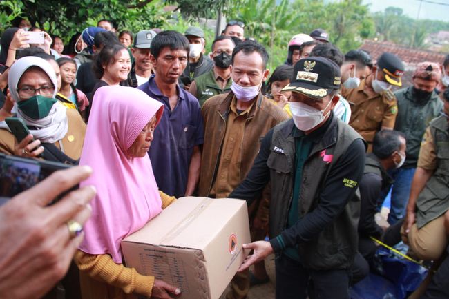Bupati Bandung Dadang Supriatna tinjau lokasi longsor pada bagian tembok penahan tebing (TPT) di Kampung Pasir Huut, Desa Bojong, Nagreg, Kabupaten Bandung. Dalam kunjungan tersebut, Dadang meminta Kepala Desa untuk menginventarisir rumah warga yang rawan terancam longsor di Kecamatan Nagreg.