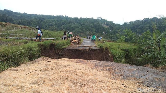 Akses jalan penghubung Kecamatan Sindangwangi-Rajagaluh, Kabupaten Majalengka putus akibat akibat ambles usai diguyur hujan deras. Aktivitas warga pun terganggu.