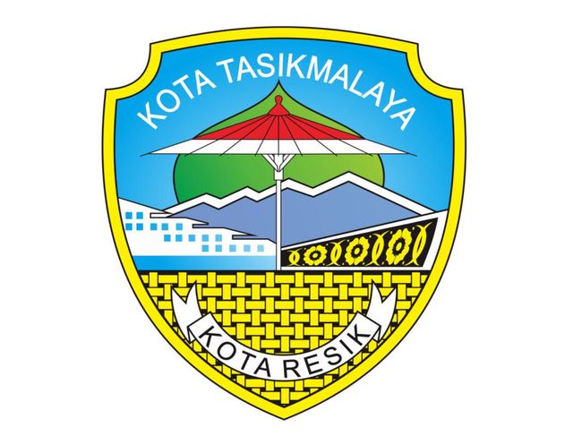 gambar, warna dan bentuk serta dibagian atas terdapat tulisan "Kota Tasikmalaya" dan di bagian bawah terdapat tulisan "Kota Resik" dengan warna huruf hitam di atas pita warna putih.