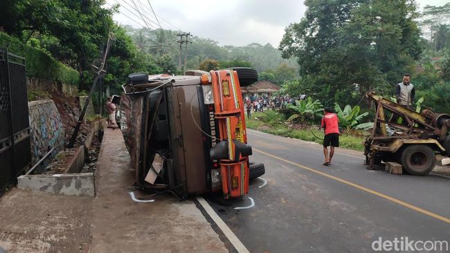Berikut penampakannya truk pengangkut minyak goreng terguling di Ciamis. (Fotografer: Dadang Hermansyah/detikJabar)