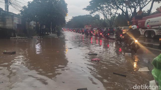 Pantauan detikJabar, genangan dari tol air Gedebage sudah mulai menutupi satu lajur di jalan raya. Pemandangan itu bisa dilihat tepat di depan kantor pos polisi Pasar Induk Gedebage.