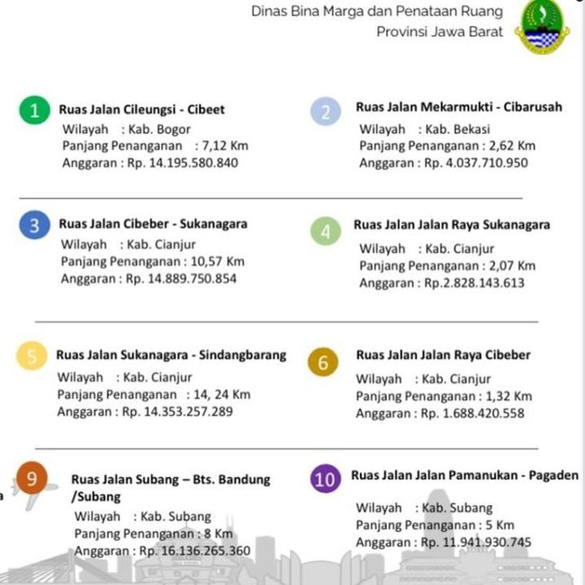 Melalui postingan Instagram pribadinya pada Sabtu (9/4/2022), Gubernur Jawa Barat Ridwan Kamil mengatakan, bahwa Pemprov Jabar melalui Dinas Bina Marga dan Penataan Ruang akan menggelontorkan total anggaran Rp 27 miliar lebih hanya untuk perbaikan jalan di Kabupaten Subang.