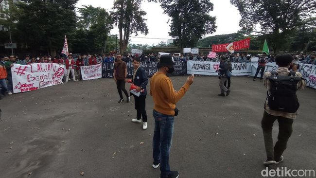 Massa langsung berorasi di depan Gedung Sate, Senin (11/4/2022). Mereka membentuk lingkaran. Ragam spanduk itu dibentangkan demonstran.