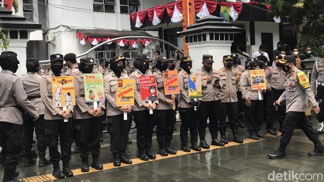 Pantauan detikJabar di lokasi, para polwan ikut mengawal aksi demo di Sukabumi. Mereka membawa papan bertuliskan macam-macam ajakan orasi damai seperti 'Polisi Hanya Menjalankan Tugas,' 'Waspada Penyusup,' 'Polisi Bukan Musuh,' Yuk Kita Demo dengan Damai' dan lain-lain.