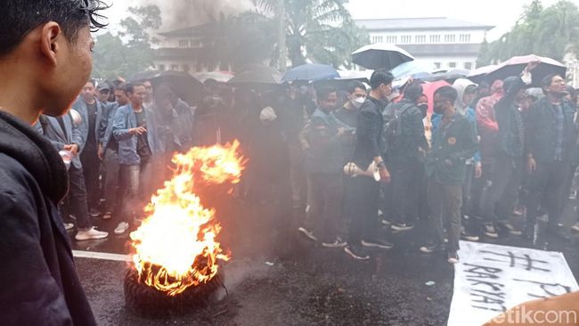 Pantauan detikJabar di lokasi, para massa membentangkan spanduk sepanjang 30 meter dengan berbagai tulisan seperti 'Info Slot Gacor Buat Beli BBM' atau 'Negeri Hukum yang Menyengsarakan Rakyat di Atas Kebijakan Tikus Berdasi.' Mereka didominasi menggunakan jas almamater berwarna biru.