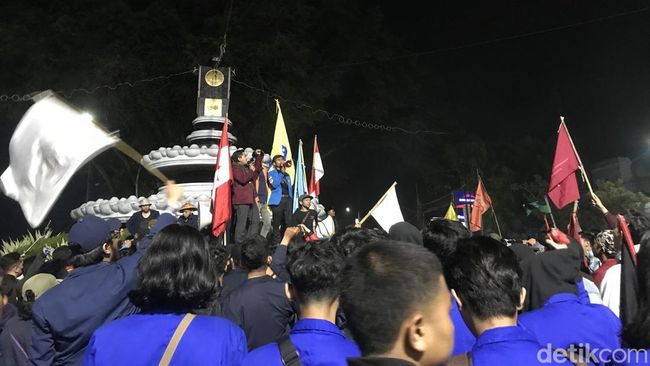 Pantauan di lokasi pukul 19.00 WIB, para mahasiswa masih berkumpul di Tugu Adipura setelah melakukan longmarch dan orasi di Balai Kota dan DPRD Kota Sukabumi. Massa juga masih menggaungkan orasi di atas mobil komando.