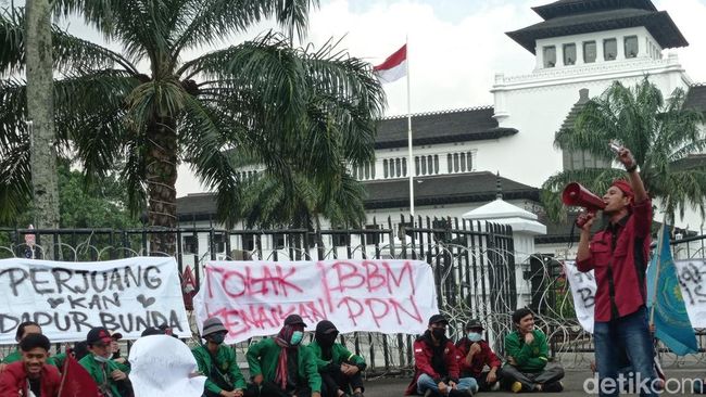 Elemen Muda Persis membentang berbagai spanduk di pagar Gedung Sate yang telah dipasang kawat berduri. Salah satunya spanduk bertuliskan 'Perjuangkan dapur bunda'.