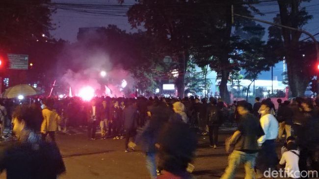 Pantauan detikJabar, massa sempat menyalakan flare. Hingga pukul 18.30 WIB, massa masih bertahan.