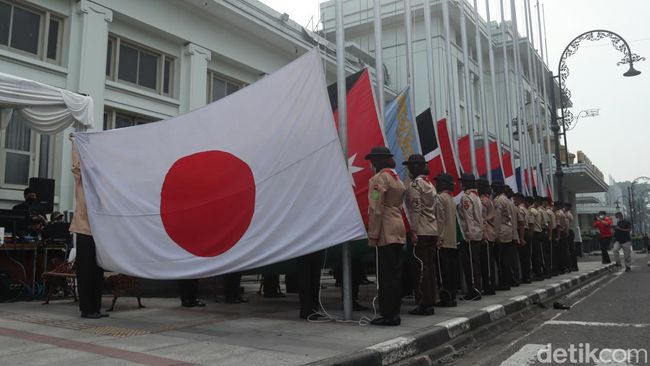 Pantauan detikJabar, Senin (18/4/2022) pagi sekitar pukul 08.00 WIB, 109 bendera itu dikibarkan ratusan anggota Pramuka Kwarcab Kota Bandung di tiang bendera yang mengelilingi Gedung Merdeka.