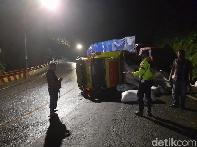 Truk colt diesel yang terguling diketahui bernomor polisi E 9677AB yang dikemudikan oleh Samsul (55). Truk tersebut bermuatan bahan benang yang hendak menuju Brebes dari Majalaya, Kabupaten Bandung.