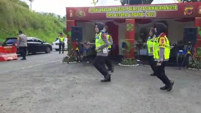 Sejumlah polwan yang tengah bertugas di pos terpadu Leter U Gentong, Kecamatan Kadipaten, Kabupaten Tasikmalaya, berinisiatif menghibur pemudik yang melintas. Para polwan itu bernyanyi dan menari.