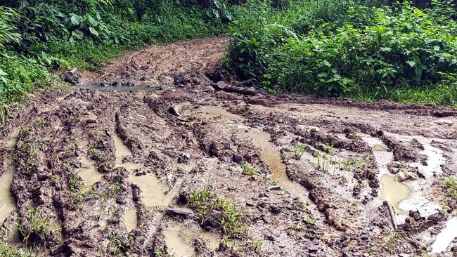 Kondisi semakin miris ketika musim hujan tiba. Anak-anak sekolah menjinjing sepatu melintasi jalanan yang beralaskan tanah melalui tanah becek berlumpur dan licin.