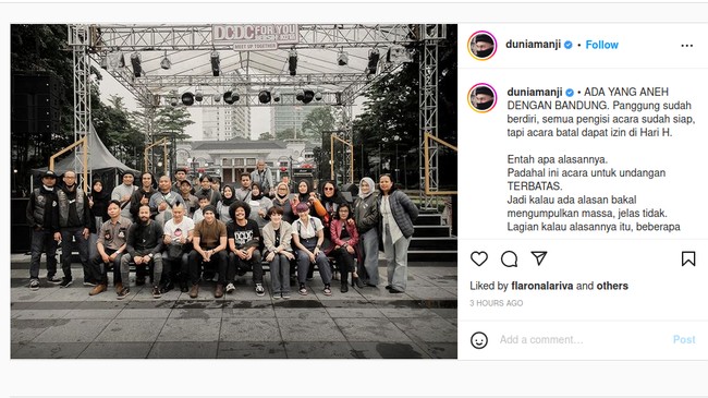 Musisi Anji gagal manggung dan mengisi acara musik di Balai Kota Bandung gegara masalah perizinan. DCDC sebagai pihak penyelenggara acara tersebut pun lalu menceritakan detik-detik acara musik itu batal digelar.