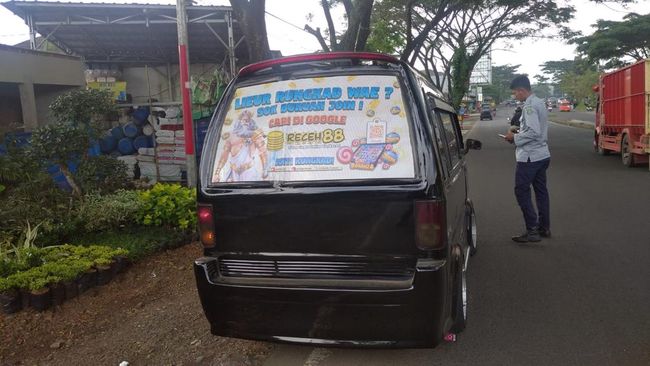Pemandangan tak biasa terlihat di beberapa angkutan kota (angkot) Sukabumi. Di bagian kaca belakang transportasi umum itu terpasang iklan ajakan judi online.