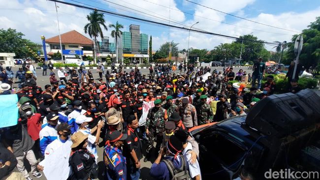 Ratusan orang dari massa gabungan berunjuk rasa soal jalanan rusak di Karawang Utara. Aksi demonstrasi dilakukan di depan gerbang masuk kantor Pemkab Karawang.
