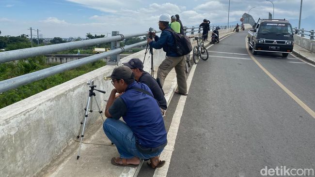 Dari kejauhan mereka sedang memegang tripod dan mengarahkan kamera telepon genggamannya ke arah proyek pembangunan Kereta Cepat Jakarta Bandung (KCJB) yang saat ini sedang melakukan pemasangan girder.