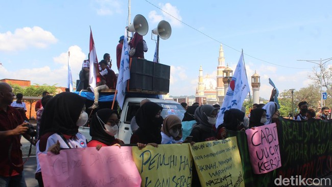 "Hari ini kami (KSPN) menyuarakan aksi unjuk rasa ke lembaga legislatif bersama SPSI dan kawan-kawan buruh lainnya yang tergabung FSPMI dan PPMI itu mendatangi eksekutif atau ke kantor Bupati," kata Ditto diwawancarai detikJabar.