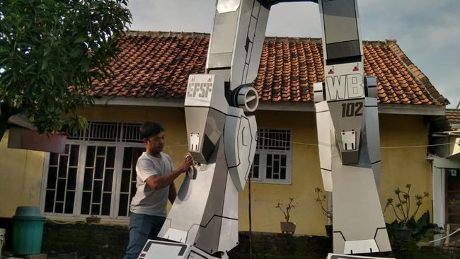 Anwar Maulana (42) belakangan menjadi viral lantaran karya robot Gundam yang berukuran jumbo. Terakhir, ia membuat robot dari seri non fiksi itu yang berukuran 5 meter lebih. Simak foto-fotonya.
