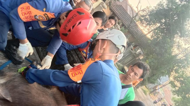 Sekitar satu jam proses evakuasi dan babi hutan itu berhasil dijinakkan menggunakan alat seadanya oleh tim Dinas Pemadam Kebakaran dan Penyelamatan.