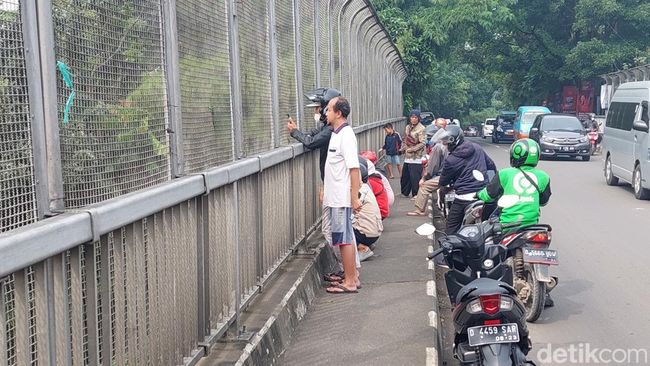Berdasarkan pantauan detikJabar, Senin (13/6/2022) pukul 09.45 WIB, sejumlah warga berdiri di atas trotoar jembatan yang di bawahnya merupakan ruas Jalan Tol Purbaleunyi. Sementara kendaraannya terparkir di pinggir jalan.