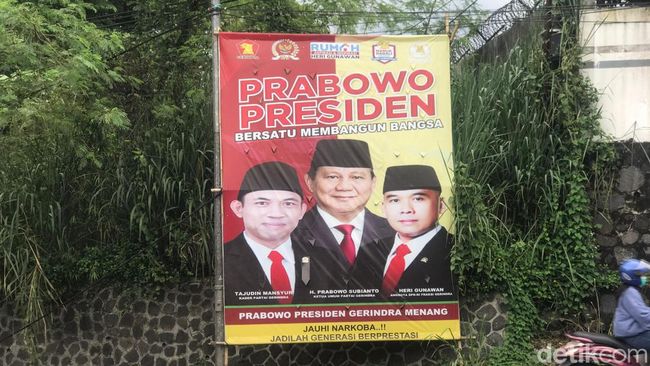 Foto Prabowo Subianto yang juga menjabat sebagai Ketua Umum Partai Gerinda terpampang di bagian depan. Samping kanan dan kirinya ada anggota DPR RI Fraksi Gerindra Heri Gunawan dan Kader Partai Gerindra Tajudin Mansyur.