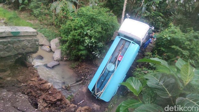 "Kalau lewat sini lebih dekat, karena ambruk jadinya harus memutar. Makanya disayangkan truk air mineral ini membuat jembatan penghubung Sukaratu dan Bangbayang jadi ambruk," kata dia.