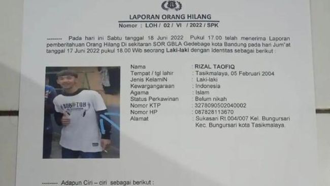 Rizal Taofiq (18), warga Bungursari, Kota Tasikmalaya sempat dikabarkan hilang saat hendak menyaksikan pertandingan Persib Vs Persebaya di Stadion GBLA, Kota Bandung, Jumat (17/6) lalu. Rizal pun kini sudah ditemukan dan telah kembali ke rumahnya.