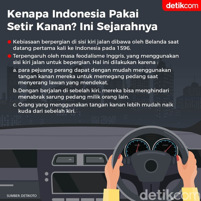 Jakarta - Kenapa Indonesia menerapkan setir kanan? Hal itu terkait dengan status Indonesia sebagai jajahan Belanda. Kebiasaan berpergian di sisi kiri jalan dibawa oleh Belanda saat datang pertama kali ke Indonesia pada 1596.