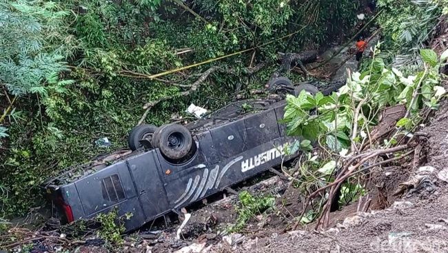 Bus yang melaku dari arah Bandung menuju Tasikmalaya itu oleng ke kiri dan masuk ke jurang sebelum akhirnya mobil terguling ke samping di dasar sungai. Ketinggian dari badam kalan sekitar 10 meter.