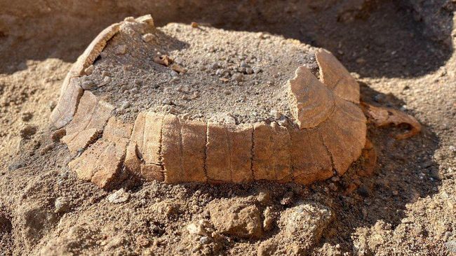 Sekitar 2.000 tahun silam, kura-kura berukuran 14 sentimeter itu menggali ke bawah tanah untuk membuat sarang di bawah sebuah toko yang hancur akibat gempa.