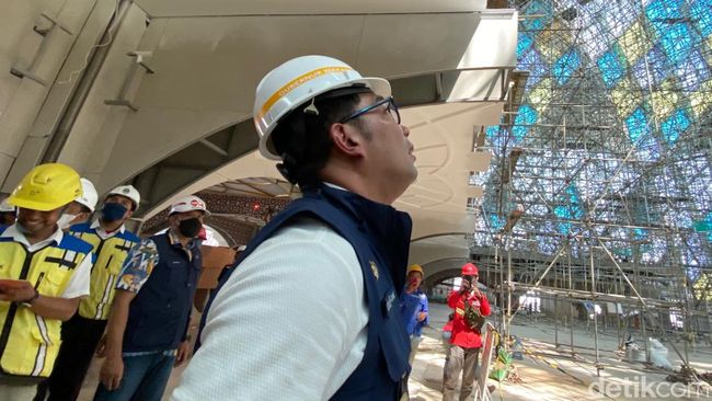 Setelah itu, Ridwan Kamil masuk ke dalam bangunan masjid. Rangka-rangka besi masih terlihat. Ia juga melihat lampu hingga contoh karpet yang akan dipasang di dalam masjid yang didesainnya langsung di masa kepemimpinan Gubernur Jabar Ahmad Heryawan.