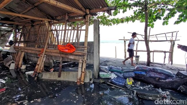 Pantauan detikJabar, gelombang datang membawa tumpukan pasir di area warung mereka. Beruntung beberapa pengelola warung sudah memasang "benteng" di depan area warung mereka yang mengarah ke bibir pantai untuk mengurangi dampak ketinggian gelombang.