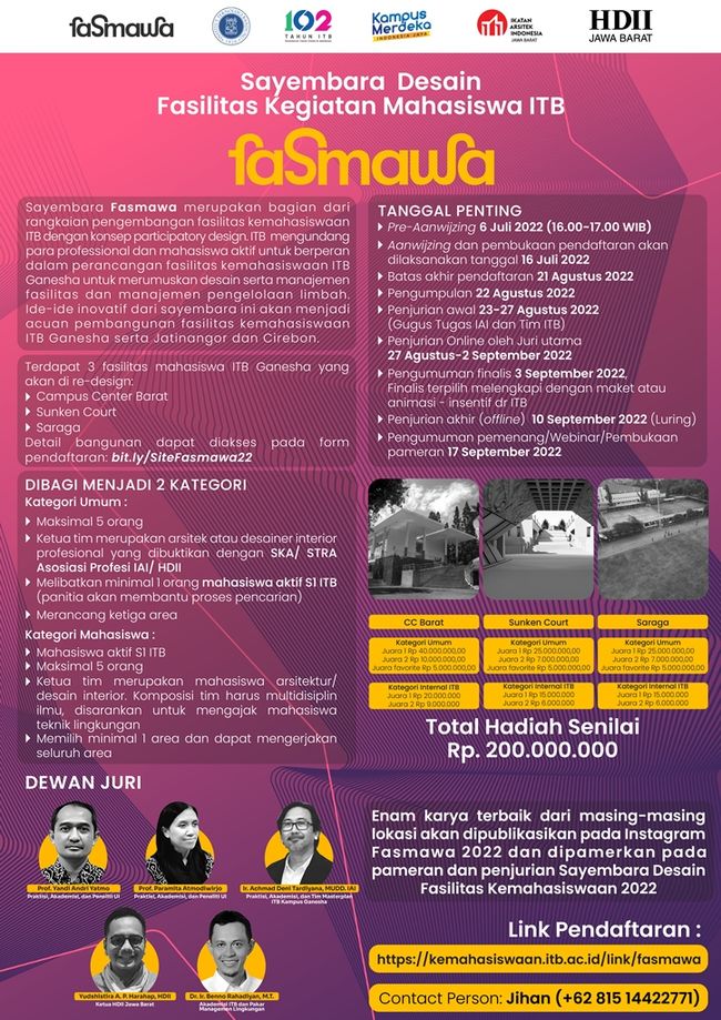 Berikut link pendaftaran sayembara desain Fasmawa ITB: https://kemahasiswaan.itb.ac.id/link/fasmawa