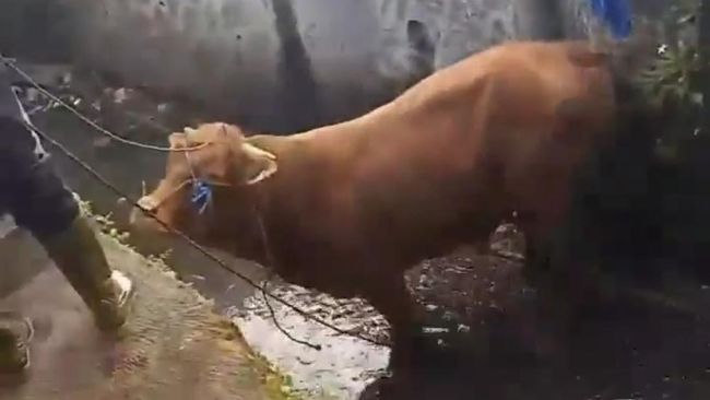 pun sempat terekam warga dan viral di media sosial. Dalam video berdurasi 8 detik yang tersebar di media sosial, terlihat seekor sapi sudah dalam kondisi terjatuh di bawah sungai.