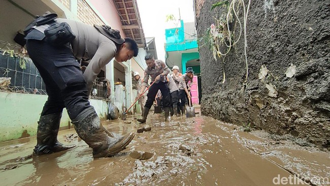 Masyarakat saling bahu-membahu mengevakuasi barang-barang yang masih bisa diselamatkan dari sisa banjir semalam. Material lumpur yang paling banyak ditemui warga.