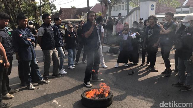 Pantauan detikJabar di Jalan Suryakencana, mahasiswa sempat membakar ban motor dan melakukan aksi dorong pagar kantor Dinkes. Para petugas kepolisian terlihat berjaga di beberapa titik.
