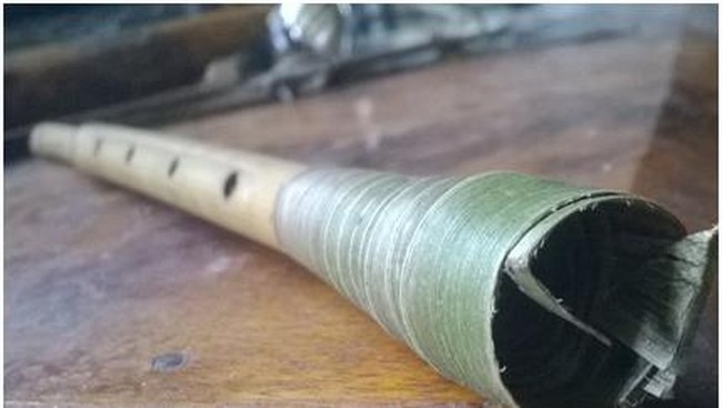 Lubang yang sama dibuat pula pada sisinya, tepat bersebelahan dengan lubang lainnya. Dari lubang diukur satu kali panjang lingkaran bambu itu, selanjutnya mulai dari ujung bambu tersebut diraut sehingga terbentuk dua lidah bambu yang agak pipih. Panjang lidah simetris itu 3 kali panjang lingkaran bambu, antara pangkal kedua lidah sampai ke masing-masing lubang kecil yang telah dibuat terlebih dahulu barulah dibuat celah pada dinding berikutnya.