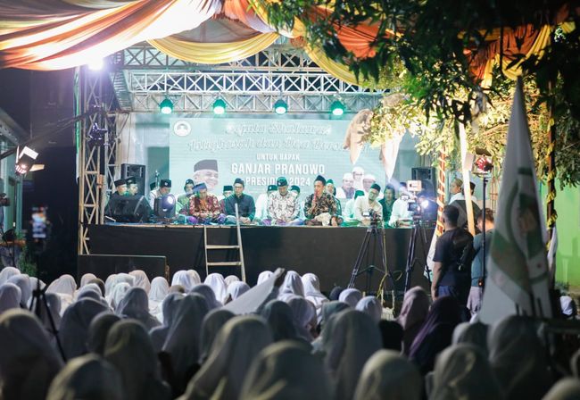 Sejumlah santri bersama sejumlah ulama di Kabupaten Karawang, Jawa Barat (Jabar) menggelar acara 'Sejuta Salawat dan Doa Bersama untuk Bangsa'. Dalam acara ini, mereka juga menyatakan dukungan kepada Ganjar Pranowo maju sebagai Presiden RI 2024.