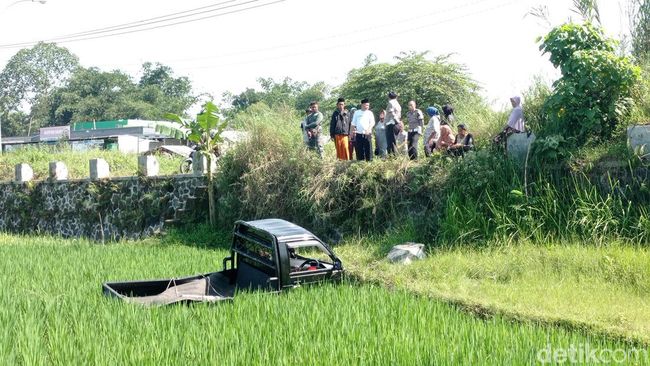Sebuah mobil bak terbuka terjun ke sawah setelah bersenggolan dengan sepeda motor. Kedua pengemudi kendaraan selamat, hanya mengalami luka ringan.