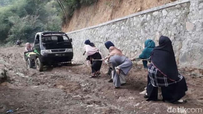 Rombongan emak-emak tarik mobil pikap menggunakan tali tambang di Kabupaten Cianjur. Mereka terpaksa melakukan aksi tersebut gegara mobil yang ditumpangi terjebak di jalan penghubung antar desa di Kecamatan Campaka rusak parah.