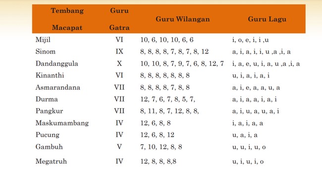 Setiap jenis tembang mempunyai pedoman yang sudah ada dan tidak bisa berubah tentang jumlah wanda/suku kata dalam setiap barisnya.