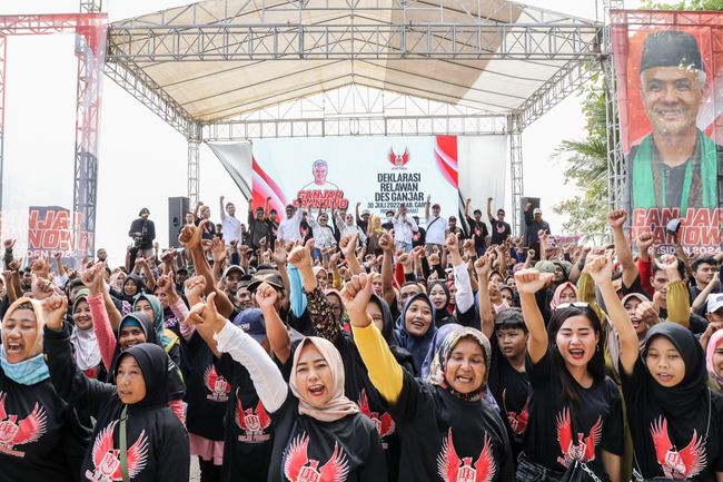 Ribuan warga desa yang tergabung dalam Des Ganjar (Desa untuk Ganjar) Kabupaten Garut mendeklarasikan dukungan kepada Ganjar Pranowo sebagai Presiden 2024 di kawasan Pantai Rancabuaya, Desa Purbayani, Caringin, Jawa Barat.
