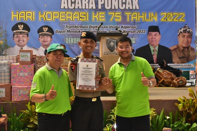 Dewan Koperasi Indonesia Daerah (Dekopinda) Kabupaten Sumedang memberikan penghargaan kepada 10 Koperasi Berprestasi Kabupaten Sumedang, 5 pelaku UKM Berprestasi, 10 Tokoh Koperasi Berprestasi dan para pemenang Cerdas Cermat Perkoperasian antar SLTA dalam rangka Hari Koperasi Nasional Ke-75.